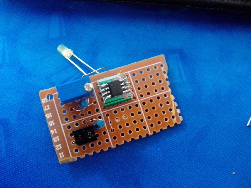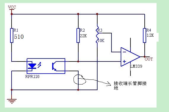 RPR220的电路图应用 发布时间:2013-04-19 14:43:25 · 9814 阅读 · 0 评论 搭棚电路:LM393来自德赛电池充电器, 实在没本事拆下 就这样用了 , 不过也好总算也是成功了 电路图转自百度 电阻经过多次试验后的最终值: R1:510 R2:22k R4:12k R3用的是精密可调高电位器 三角形为LM339 RPR220蓝色灯为发送红色灯为接收 注意接收端是长引脚接地……