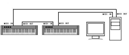 有些计算机音序软件支持用电脑键盘模拟琴键,可通过计算机键盘将音符输入计算机,有爱好者就用电脑键盘的控制芯片改装玩具电子琴,将其并接在计算机键盘上,称之为电脑琴,但这种控制芯片本身并不是为演奏音乐开发的,单音演奏还可以,在多个按键压下时会出错。本文将介绍如何用通用单片机实现MIDI键盘功能,并改装各种电子琴,与计算机连接,从而实现通过MIDI接口,把电脑变成真正的,可支持复音的电子琴。 一、MIDI信号及声卡的MIDI接口 MIDI 是一种异步串行通讯协议,其传输速率为31.25 K baud (每秒31250位),每个字节包括10 位,1个起始位,8个数据位,1个停止位,每个音符的开(或关)命令有3个字节,经计算,不到1mS即可传输一个音符的开关命令。MIDI的数据流是单向的,不进行应答,设备发送音乐信息时,不管接收设备的状态,而接收设备收到的信息,经校验正确的则执行,错误的就忽略——这样规定是由音乐本身的特点决定的,可以丢掉音符,但不能搞错节拍,实时性最优先。从物理层面上看,MIDI信号是电流传输的,5mA代表逻辑“0”,0mA代表逻辑“1”。MIDI设备连接时,必须将输出与另一设备的输入连接。 图1 典型的多个MIDI设备连接方式