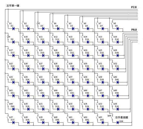 图 4 控制部分印制板图 采用89c51或兼容单片机 四、用玩具琴键盘改装MIDI键盘 要分辨数十个按键的状态,最简单经济的方式就是采用矩阵式扫描键盘,其电路原理图如图5所示 图5 键盘的电路原理图