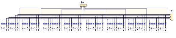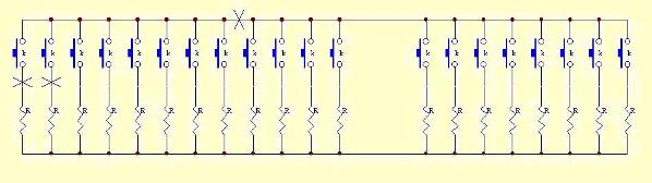 MIDI协议中规定,全部的音符共128个,中央C音符对应的键值为60,为适合不同键数的键盘,必须为扫描到的键值加上相应的初值,使得第一个键正是所需的音符,程序中的变量addition 就是这个初值。 主程序的工作过程是上电复位后初始化,随后循环调用键盘扫描程序,在本人提供的程序中还加进了诸如移调,通道号设置,初始值设定等功能,全部用单片机剩余的I/O口对地短路来设定,以适合各种不同的键盘,详见程序文件。将程序用C51编译软件编译成执行代码,烧录至51单片机芯片,和外围器件一起装到印制板上,就制成了MIDI键盘控制板。 本人利用上述控制板,分别用玩具琴和低档电子琴的键盘,改装了多个MIDI键盘,均获成功,受到好评,现一一介绍: 1.钢片琴:老式的阻容震荡式电子琴,等效电路如图6,它是用按键选通不同阻值的电阻, 改变振荡器的频率来产生音符的,当两键同时压下,将导致电阻并联,参数混乱,还有的采用串联电阻网络,多键压下时,只有与振荡电路最近的一个电阻有效, 而其他的被短路, 因此都不能支持复音,只能单键演奏,不能直接改成扫描式键盘,须作较大改动。 改装时,去除所有的振荡电阻,将钢片电极剪为数段,每8个键为一段,每段接一位段扫,从左至右对应单片机P0口,从低到高。每段按键都由8个键组成,经二极管(1n4148)按顺序将每段相应的按键连在一起,接入一路位扫(P2),最后一段不足8个可空着,共8路,最终电路参考图7。 图6 钢片琴改装示意 图7 改装后的玩具琴键盘电路图 ,P0与P2接在控制板相应的连线上